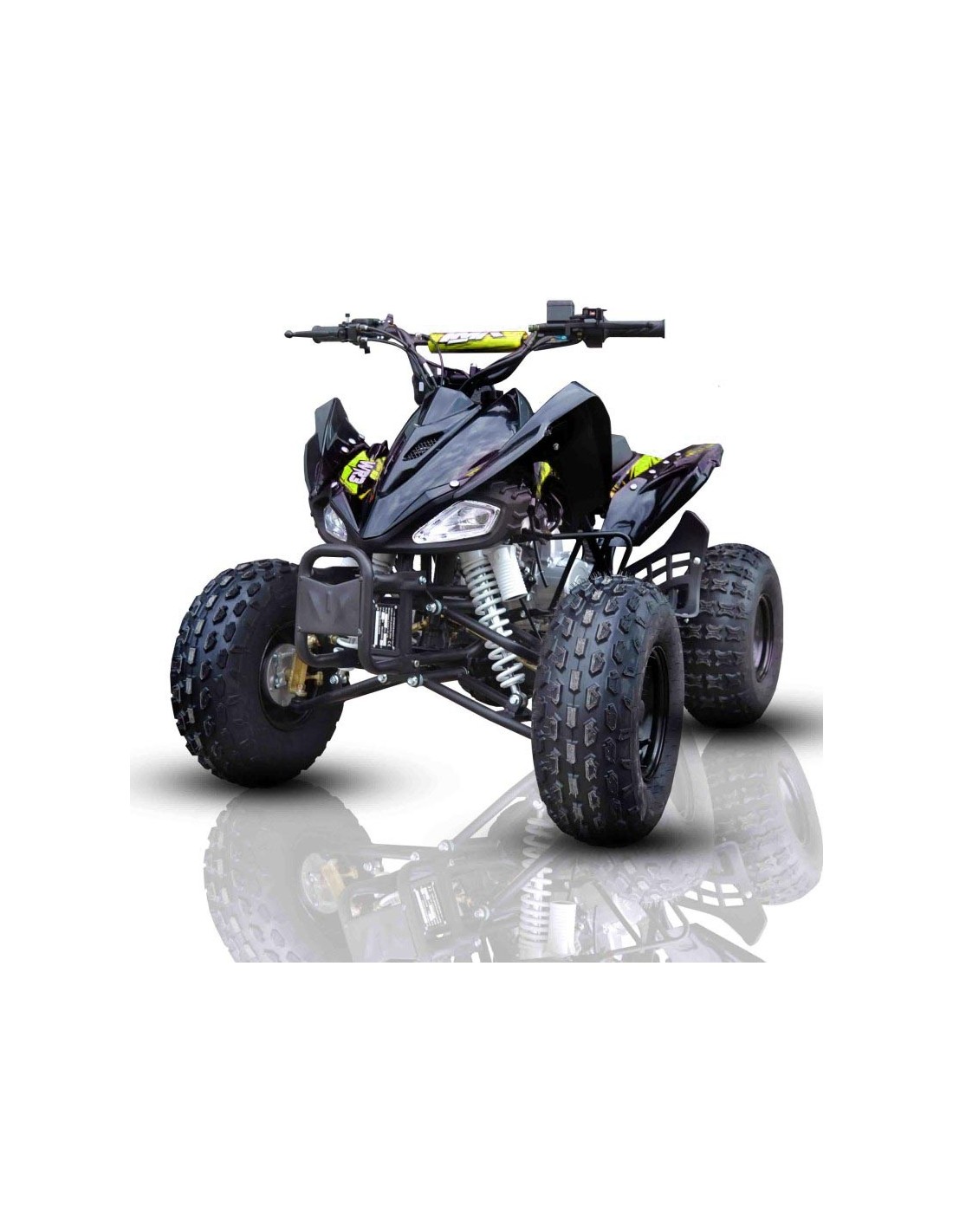 Nuevo Mini Quad IMR modelo VENOM de 4 tiempos, 125cc y potencia de 9cv. Su cómodo arranque eléctrico te encantará. Disfruta su cambio de marchas semiautomático con marcha atrás. Chasis y basculante de acero. Doble amotiguación delantera de 325mm con tensión de muelle ajustable. Mono-amortiguador trasero de 260mm con tensión de muelle ajustable. Freno delantero de doble tambor con zapatas y accionamiento mecánico. Freno trasero de disco de 170mm con pinza de accionamiento hidráulico. Rueda delantera y trasera con llantas de 8 pulgadas modelo IMR Racing.
