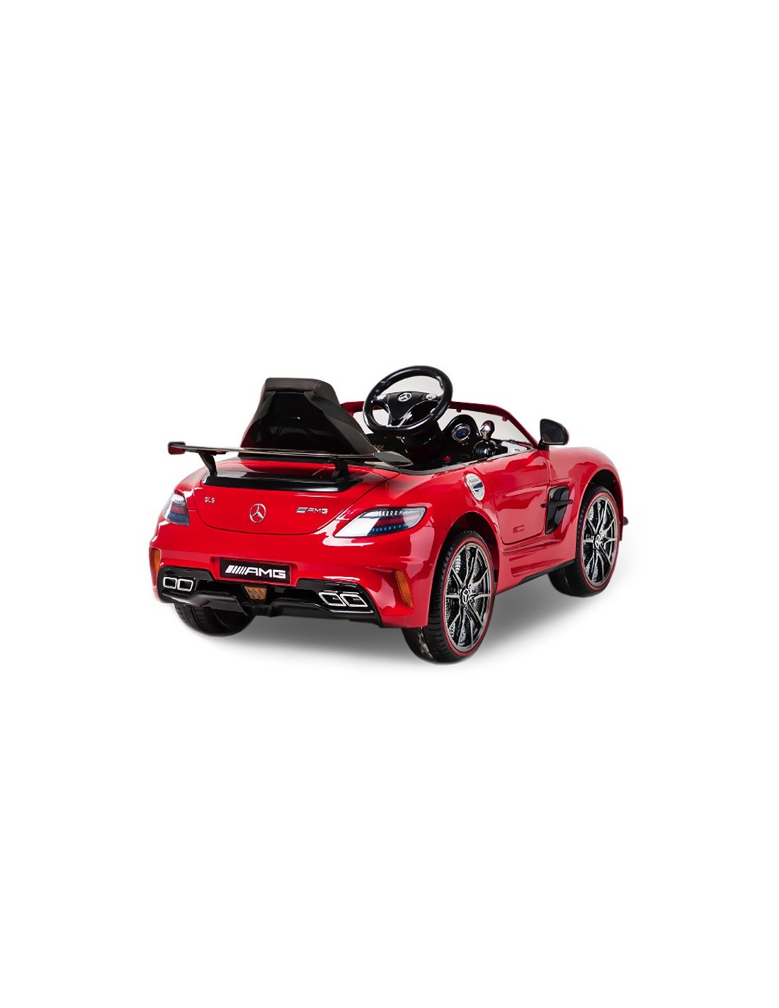 - producto con licencia Mercedes SLS AMG Deluxe - Asistencia de Transporte (asa y ruedas para dibujar con poca o ninguna energía de la batería) - eléctrico de dirección asistida - dos motores cada 25W - 2.4 G teledirigidos alcance de hasta 100m - asiento de cuero sintético con el cinturón de 3 puntos - Control ya sea por control remoto o pedal del acelerador - - Ruedas iluminadas con LED - Efectos de luz y sonido - Conexión MP3 Toma de 3,5 "con cable incluido, puerto USB, puerto mini tarjeta SD - retroceso hacia adelante - Neumático EVA suave - Indicador de batería - Incl. Cargador